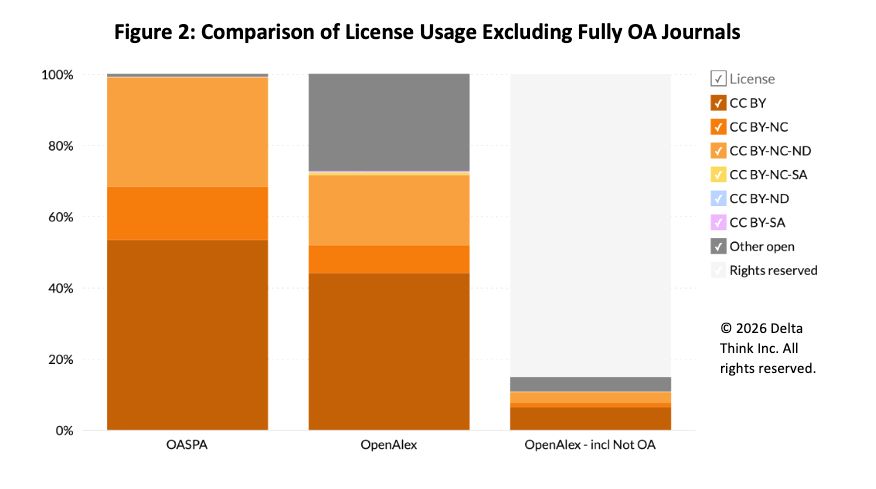 - When non-OA content is included, “all rights reserved” unsurprisingly accounts for a substantial share—reflecting the fact that open access still represents only around half of total output in 2024, as noted in our Annual Market Sizing Update.